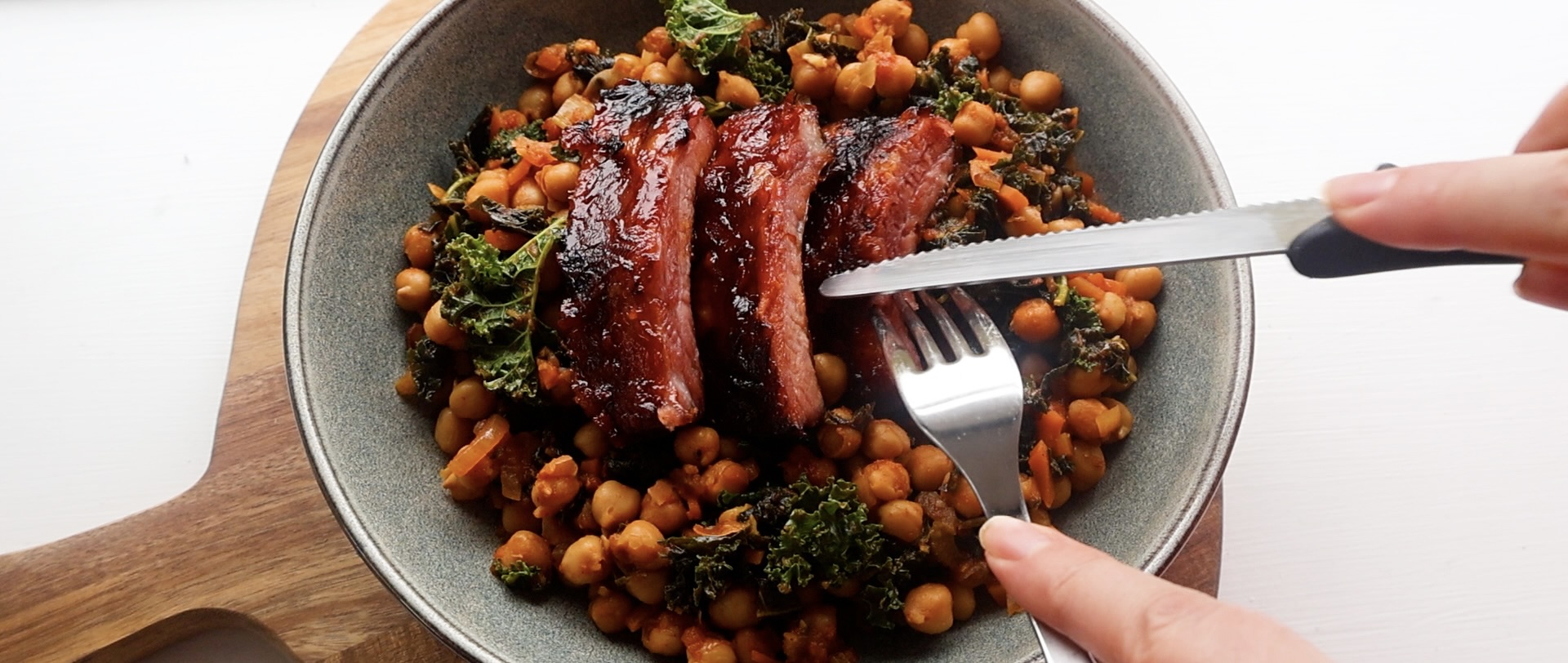 Tender roasted pork ribs, brushed with a rich barbecue glaze, served over a cozy chickpea & kale stew that’s full of warmth and spice.
